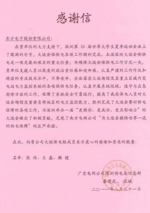 8月23日,世界大学生运动会在深圳圆满落幕,北京荣俊恺业电子技术有限公司作为大运会唯一保电企业见证了世界大学生体育运动的蓬勃发展。北京荣俊恺业电子技术有限公司技术中心系统部与工程部坚守“忠于职守,全力以赴,誓保大运电网安全”的信念,联手实现了大运保供电期间系统零故障、零缺陷的目标。